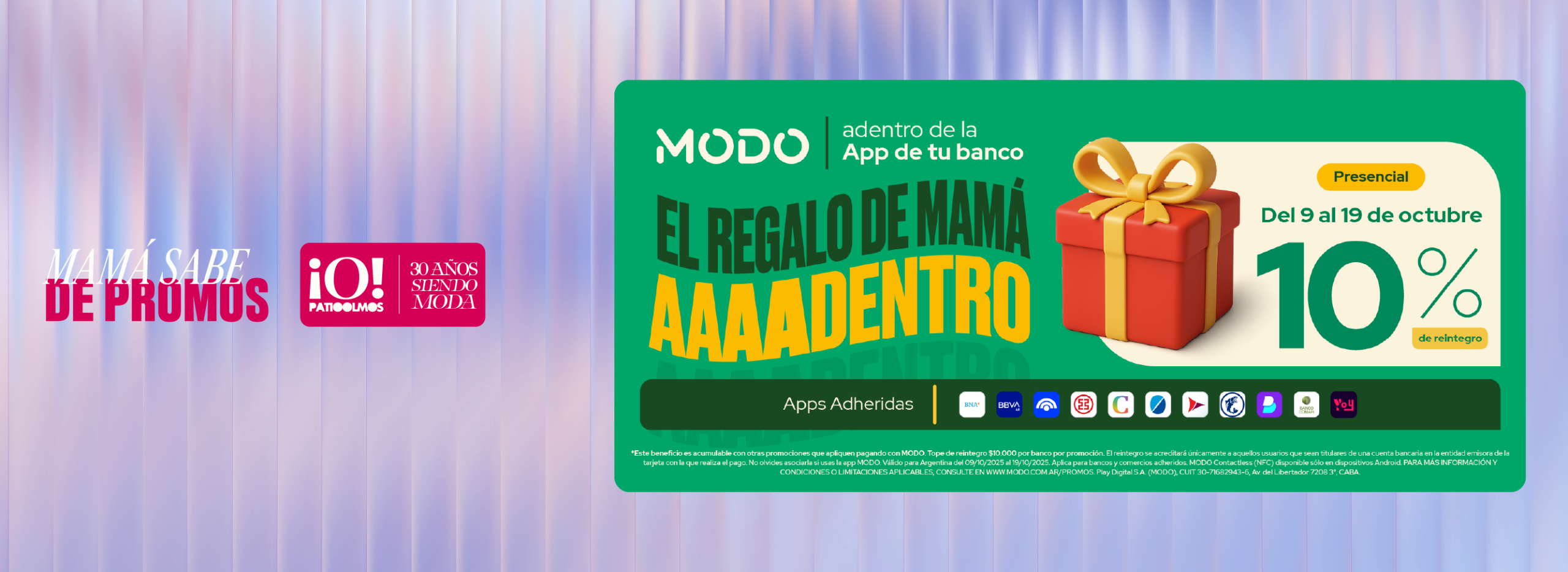 *ESTE BENEFICIO ES ACUMULABLE CON OTRAS PROMOCIONES QUE APLIQUEN PAGANDO CON MODO. TOPE DE REINTEGRO $10.000 POR BANCO POR PROMOCIÓN. EL REINTEGRO SE ACREDITARÁ ÚNICAMENTE A AQUELLOS USUARIOS QUE SEAN TITULARES DE UNA CUENTA BANCARIA EN LA ENTIDAD EMISORA DE LA TARJETA CON LA QUE REALIZA EL PAGO. NO OLVIDES ASOCIARLA SI USAS LA APP MODO. VÁLIDO PARA ARGENTINA DEL 09/10/2025 AL 19/10/2025. APLICA PARA BANCOS Y COMERCIOS ADHERIDOS. MODO CONTACTLESS (NFC) DISPONIBLE SÓLO EN DISPOSITIVOS ANDROID. PARA MÁS INFORMACIÓN Y CONDICIONES O LIMITACIONES APLICABLES, CONSULTE EN WWW.MODO.COM.AR/PROMOS. PLAY DIGITAL S.A. (MODO), CUIT 30-71682943-6, AV. DEL LIBERTADOR 7208 3°, CABA.