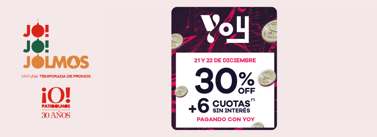 PROPUESTA PARA CARTERA DE CONSUMO VALIDA EN LA REPUBLICA ARGENTINA LOS DÍAS DOMINGO Y LUNES DESDE EL 21/12/2025 AL 22/12/2025. (1) 30% DE AHORRO Y HASTA 6 CUOTAS SIN INTERES CON TARJETA YOY MASTERCARD CREDITO Y 30% DE AHORRO CON TARJETA YOY VISA DEBITO. POR CADA $1000 DE CONSUMO SE REINTEGRARAN $ 300 EN SU CUENTA. TOPE DE REINTEGRO: $25.000 POR TRANSACCIÓN. NO VALIDO PARA COMPRAS EFECTUADAS POR MERCADO PAGO, TODO PAGO, PAGO INMEDIATO O PAGO ENTRE PERSONAS. NO ACUMULABLE CON OTRAS PROMOCIONES. VALIDO SOLO PARA CLIENTES CON VISA DEBITO YOY Y MASTERCARD CREDITO YOY. VISA DEBITO EXCLUSIVO PARA EL TITULAR DE CUENTA. NO VALIDO PARA COMPRAS MAYORISTAS. LOS REINTEGROS SE VERAN ACREDITADOS DENTRO DE LOS 30 DIAS CORRIDOS POSTERIORES A LA FECHA DE REALIZADA LA COMPRA EN EXTRACTO DE CUENTA PARA VISA DEBITO Y 90 DIAS CORRIDOS POSTERIORES A LA FECHA DE REALIZADA LA COMPRA EN RESUMEN DE TARJETA DE CREDITO. SOLO PARA CLIENTES QUE SE ENCUENTREN AL DIA EN SUS PRODUCTOS. (*) EL PLAN EN CUOTAS TIENE TASA NOMINAL ANUAL 0,00%, TASA EFECTIVA ANUAL 0,00%, COSTO FINANCIERO TOTAL NOMINAL ANUAL (CFTNA) 0,00%. INDUSTRIAL AND COMMERCIAL BANK OF CHINA (ARGENTINA) S.A.U. ES UNA SOCIEDAD ANONIMA UNIPERSONAL BAJO LA LEY ARGENTINA. SU ACCIONISTA LIMITA SU RESPONSABILIDAD AL CAPITAL APORTADO. (LEY 25738). CUIT: 30-70944784-6. FLORIDA 99, CABA CFTNA 0,00%.
