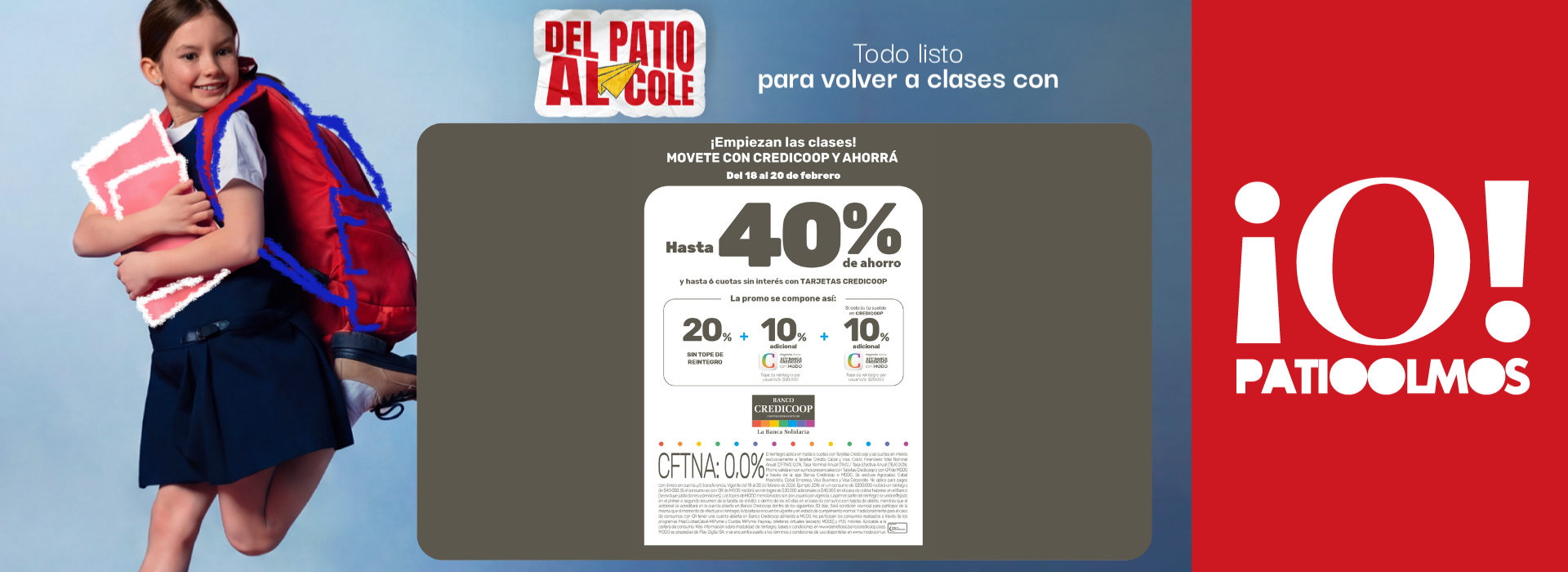 El reintegro aplica en hasta 6 cuotas con Tarjetas Credicoop y las cuotas sin interés exclusivamente a Tarjetas Crédito Cabal y Visa. Costo Financiero Total Nominal Anual (CFTNA) 0,0%, Tasa Nominal Anual (TNA) / Tasa Efectiva Anual (TEA) 0,0%. Promo válida en consumos presenciales con Tarjetas Credicoop o con QR de MODO a través de la app Banca Credicoop o MODO. Se excluye Agrocabal, Cabal Mayorista, Cabal Empresa, Visa Business y Visa Corporate. No aplica para pagos con dinero en cuenta y/o transferencia. Vigente del 18 al 20 de febrero de 2026. Ejemplo 20%: en un consumo de $200.000 recibirá un reintegro de $40.000. Si el consumo es con QR de MODO recibirá un reintegro de $20.000 adicionales o $40.000 en el caso de cobrar haberes en el Banco (se excluye jubilaciones y pensiones). Los topes de MODO mencionados son por usuario por vigencia. La primer parte del reintegro se verá reflejado en el primer o segundo resumen de la tarjeta de crédito o dentro de los 60 días en el caso de consumo con tarjeta de débito, mientras que el adicional se acreditará en la cuenta abierta en Banco Credicoop dentro de los siguientes 30 días. Será condición esencial para participar de la misma que al momento de efectuar el reintegro, la tarjeta se encuentre vigente y en estado de cumplimiento normal. Y adicionalmente para el caso de consumos con QR tener una cuenta abierta en Banco Credicoop adherida a MODO. No participan los consumos realizados a través de los programas MasCuotasCabal-MiPyme y Cuotas MiPyme Payway, billeteras virtuales (excepto MODO) y POS móviles. Aplicable a la cartera de consumo. Más información sobre modalidad de reintegro, bases y condiciones en www.beneficios.bancocredicoop.coop. MODO es propiedad de Play Digital SA, y se encuentra sujeto a los términos y condiciones de uso disponibles en www.modo.com.ar.